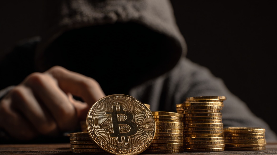 Illustration of a hooded figure holding a bitcoin amid stacks of cash